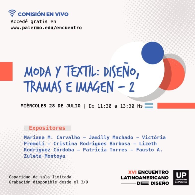 Comisión en vivo que se realizará el día miércoles 28 de Julio de 11,30 hs a 13.30 hs., en el marco del XVI Encuentro Latinoamericano de Diseño de la Universidad de Palermo.